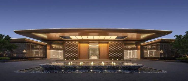 华发外滩玺项目呈现的是鎏金级归家仪式:60米宽超级大门取意安达仕酒店对称仪式感,气势恢弘。