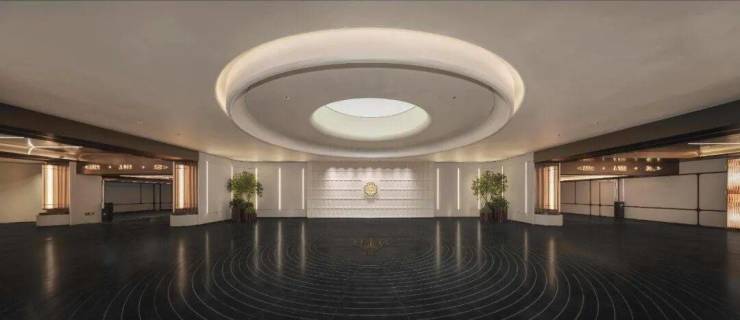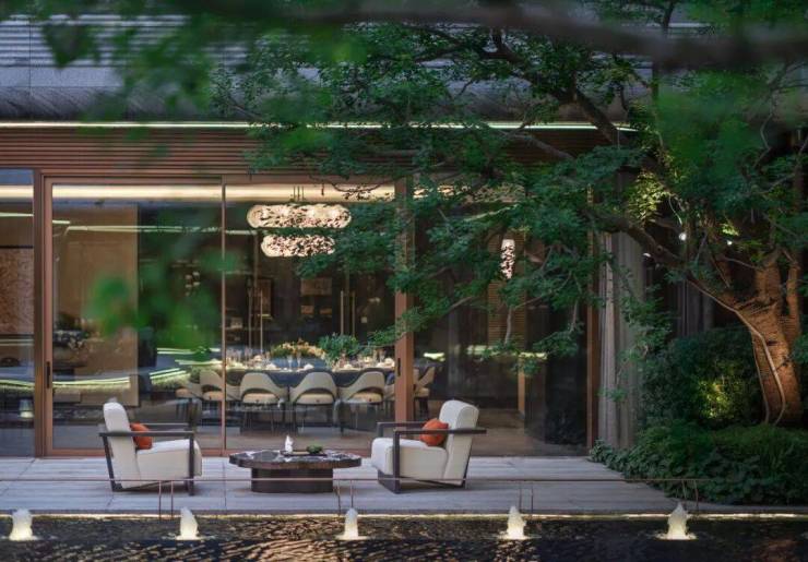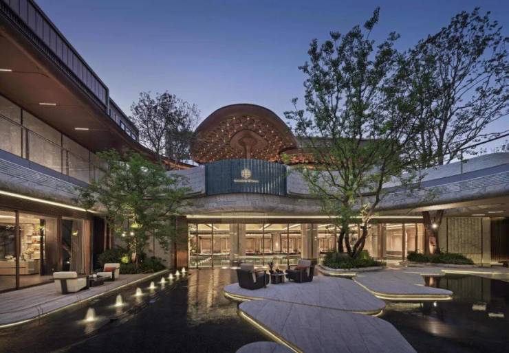 前厅为酒店式落客设计,运用大量奢石;四水归堂的黑石水景以法国进口宝格丽奢石铺就。