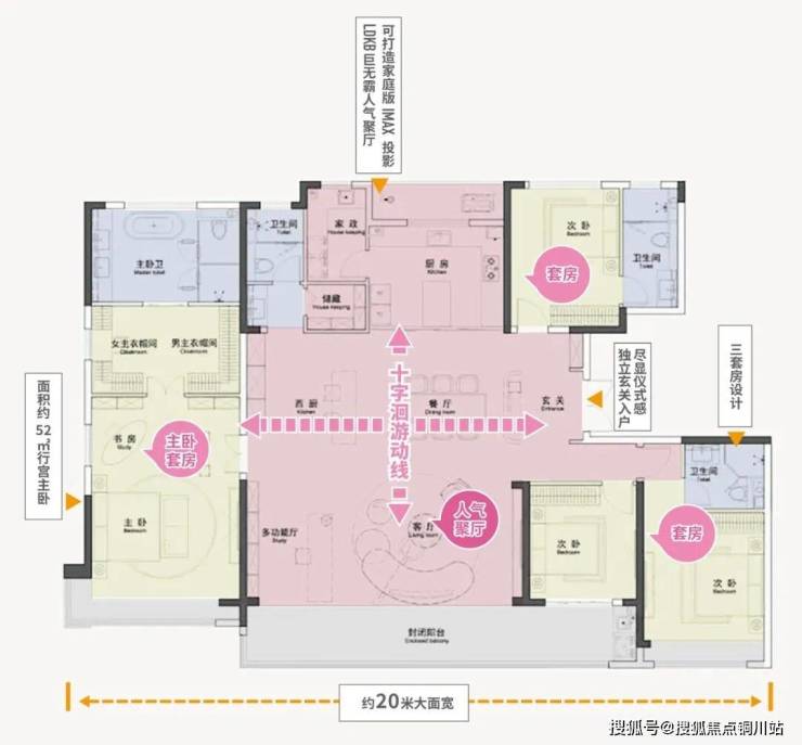 三套房设计,让每位家庭成员,都可以享受到空间平权。行宫主卧面积更是达到了约52㎡,除了大主卧,还配有男女主衣帽间、酒店式豪华洗手间、主人独立书房。