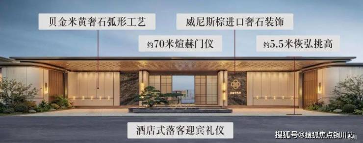 ·约70m宽恢弘门仪:威尼斯棕进口奢石大面积铺陈,贝金米黄奢石镶嵌、流畅的弧形工艺,金属燕尾折板发光吊顶以璀璨的鎏金礼遇拉开时代的迎宾序章