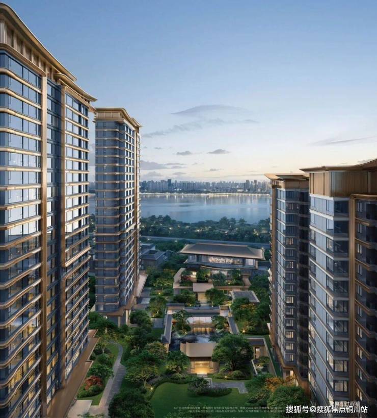 观澜屏玻璃立面映照江波,香槟金格栅勾勒鎏金气质,黄金缕线条灵动飘逸,以现代手法演绎东方飞檐意境,重塑滨江天际线。
