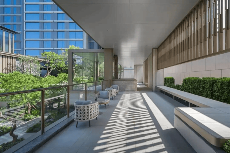 穿过大堂,100余种植物构筑的“小度假区”让人沉醉——项目团队耗时半年遍寻12城,全冠移植7棵乌桕(最大一棵91年树龄,来自武船建厂初期),15棵樱花树静待明春落雪,橘子树挂满灯笼般的果实,1.4米高的绿篱搭配繁花。这些植物早于业主一年扎根,以最佳姿态迎客。
