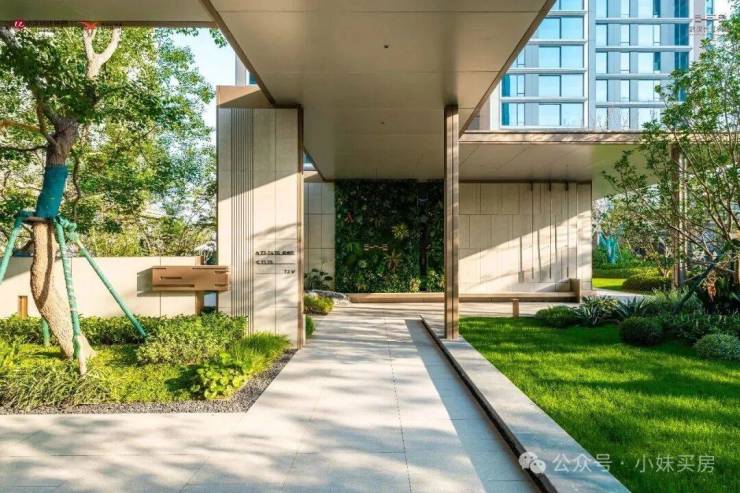 归家之旅的惊艳感,从小区主入口开始:9米高朴树与三层跌水相映,空间大师唐忠汉设计的三层挑高大堂里,水纹大理石呼应长江潋滟,木纹石前台打磨出天然弧度。