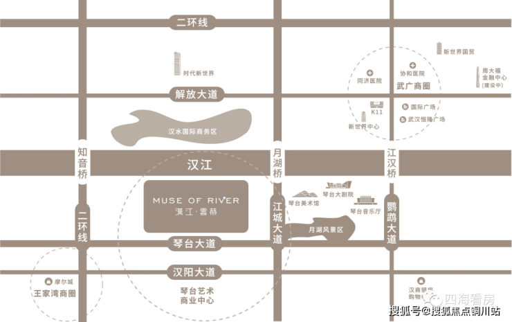 自驾:项目南门就是琴台大道,从琴台大道左转可直接上月湖桥、宝丰高架到汉口武广商圈或武汉CBD,不堵车的情况下仅需十几分钟,沿琴大道继续往东走可进入内环线。向西走可以快速上二环线,自驾到武汉各区大部分是快速路。