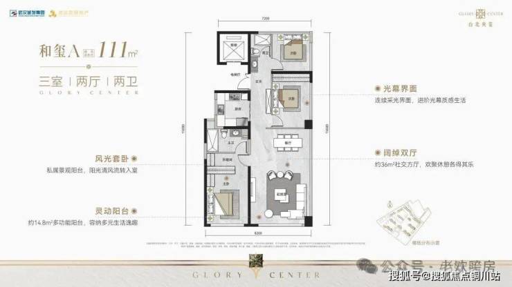 建面约111㎡三房两厅两卫,南北通透的边户,南向两开间,三面采光,南北双阳台,带独立电梯前室,拓展空间充足,客厅双面窗,采光视野不错。
