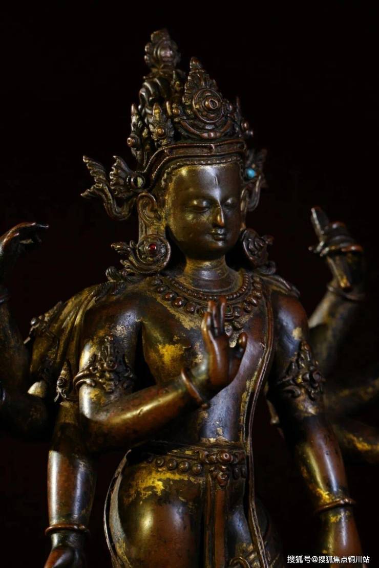 十四世纪 铜鎏金不空羂索观音:慈悲的不空羂索观音,具有着如此灵性光辉和动人心弦的审美价值,焕发出迷人的艺术魅力。整体如流水般流畅而富有韵味,东方雕塑的优雅与美感,浑然一体如实如是,初见即给人以强烈的视觉与心灵震撼。