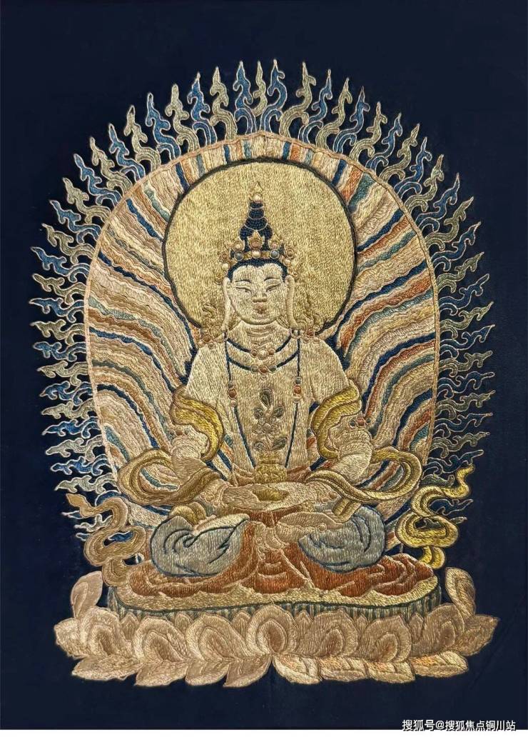 明 刺绣长寿佛唐卡:此幅明代刺绣无量寿佛,头戴五叶宝冠,顶束高髻,方脸阔鼻,面相端正温肃;佩大耳铛、项圈、璎珞、臂钏和手镯,脚镯等宝饰;身着茶色天衣,双手结禅定印,手心捧一盛有长生甘露的金瓶,结跏趺坐于束腰须弥座上。绣工精细,保存完好,造像经三、四百年的岁月洗礼,依然光彩夺目,足见其珍贵。