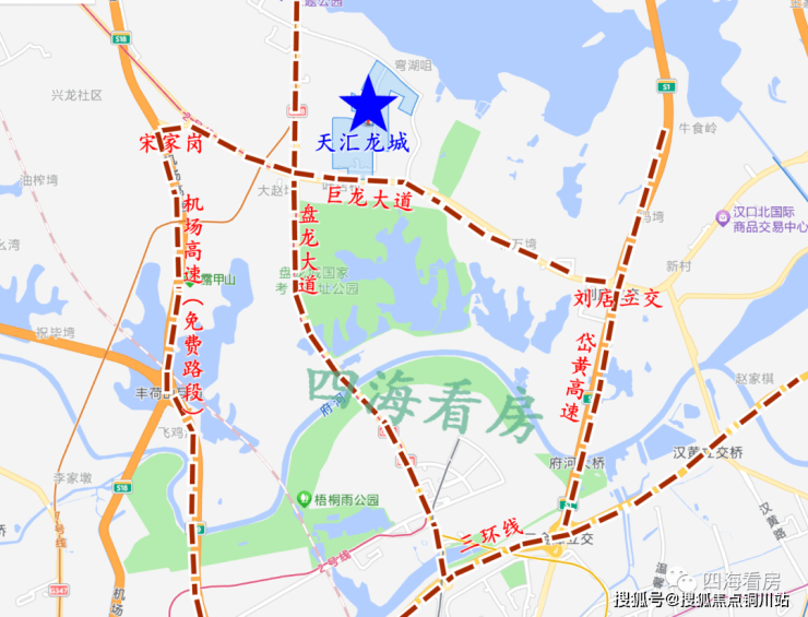 天汇龙城位于盘龙大道以东、巨龙大道以北,在楼市中属于盘龙城板块,行政划分属于黄陂,环线位置属于三环外。