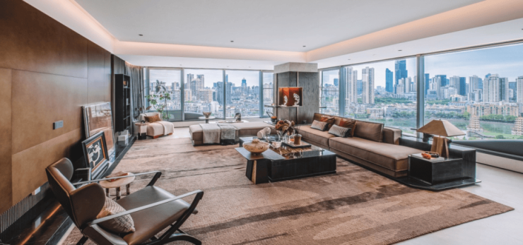 大平层设计:全部为 238㎡的四房三卫户型,五开间朝南,得房率高达 89%。客餐厅一体化设计,面积达到 94㎡,搭配约 14 米长的全景落地窗户,270° 采光视野极佳,可俯瞰宝岛公园美景。