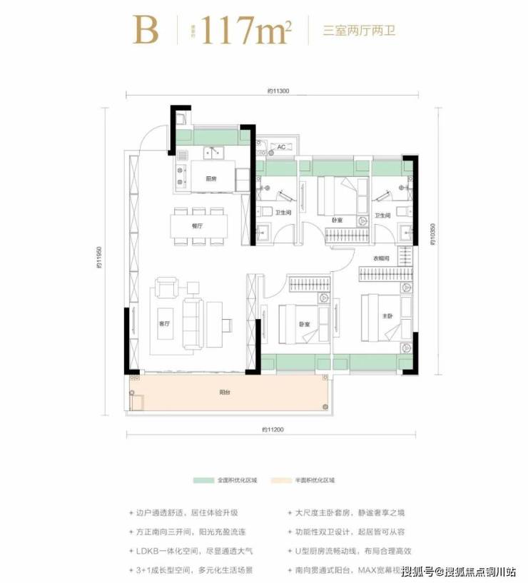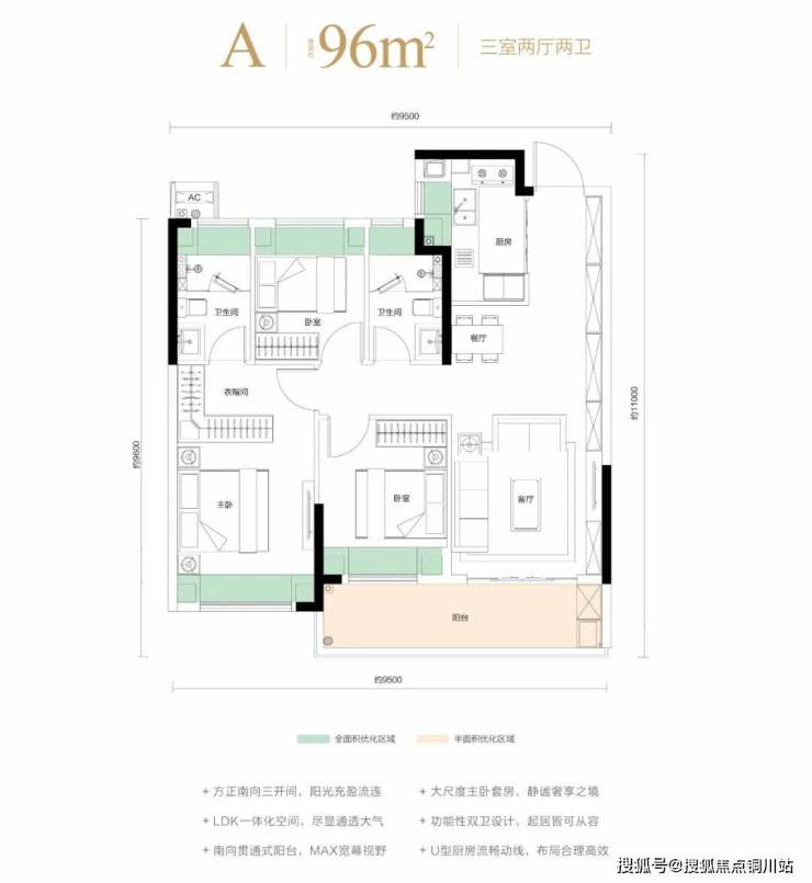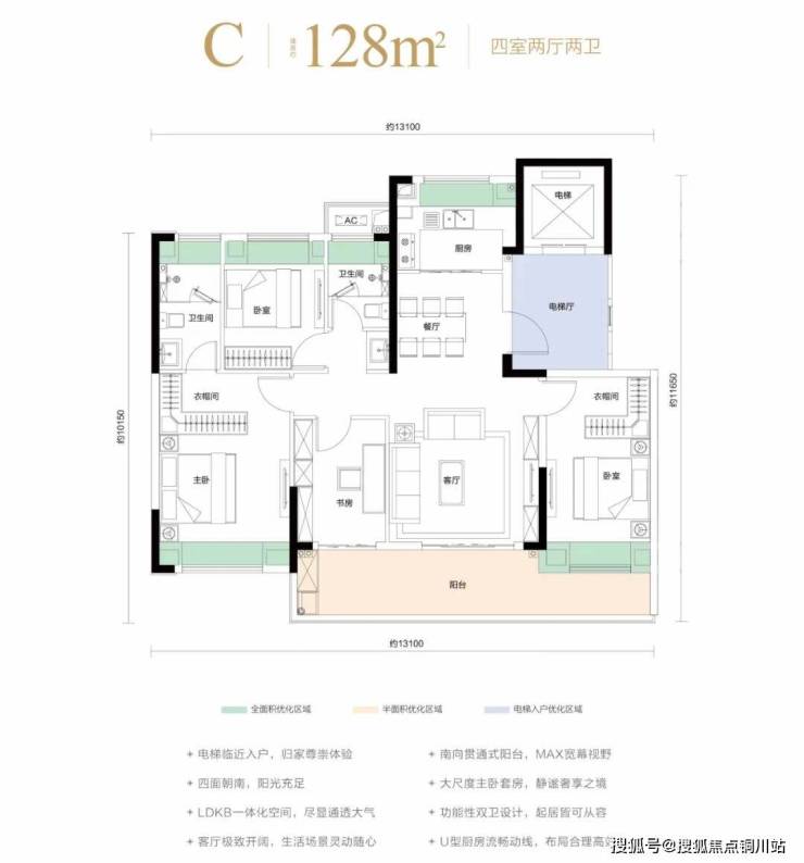作为片区内第一个准四代宅,从最小的96㎡到最大的128㎡,小高层户型层高约3m,综合得房率约97%,独梯入户的128㎡,没有算进电梯前厅的面积,就是实实在在的套内得房率。