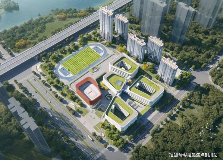 这所学校与二七滨江同款,皆为七一品牌的“嫡亲兄弟”,9年一贯制学校,建面约5.1万方,配建了足球场、体育中心、环形跑道、图书馆、艺术馆、空中花园、中心庭院、食堂等,预计2026年投入使用。