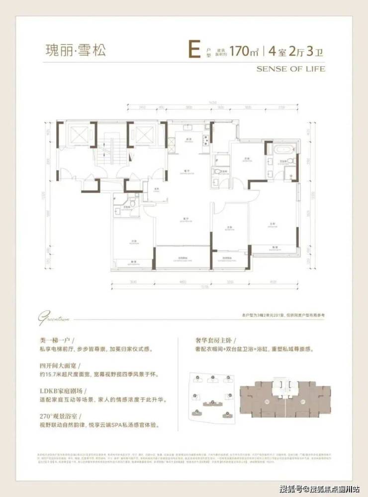 建面约170方户型实现“主卧小家化”,奢华套房式主卧,奢配衣帽间+双台盆卫浴+浴缸,同时配有大飘窗,采光和景观面不输大客厅。