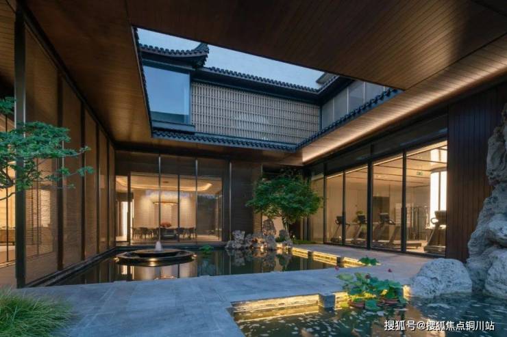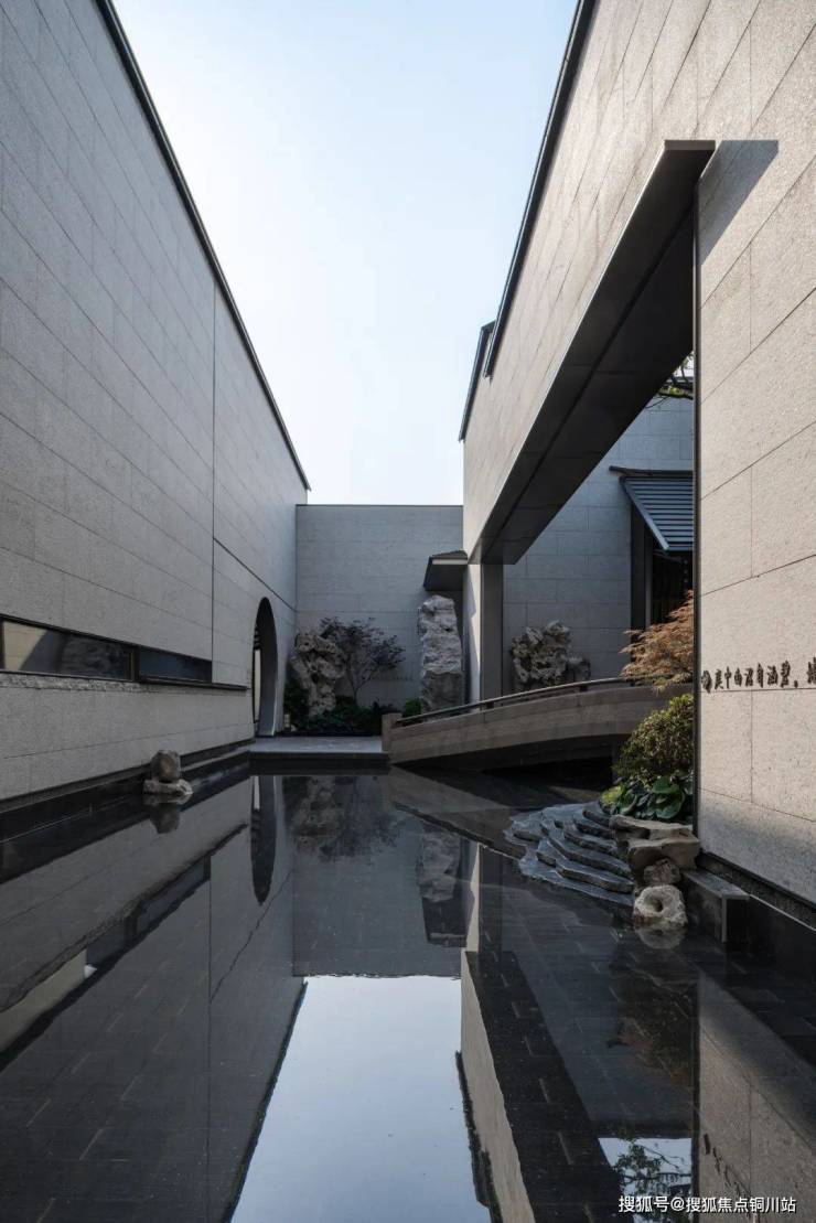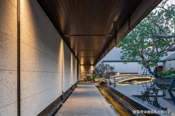 游廊设计灵感源自无锡寄畅园的“清蘌回廊”,廊墙之上开凿圆形墙洞,水底以宋代米芾《研山铭》为蓝本,采用白玉嵌金工艺铺就,既传承了文人赏石的雅致传统,又通过现代技法赋予水景金石韵味,负阴抱阳,虚实相生。