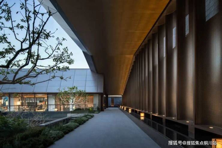归家的心境转换,从踏上约90m长专属廊桥的那一刻便已开启。这条静谧的路径,是心境从城市节奏向家园宁静过渡的缓冲。廊桥尽端,约50m宽、6m高的归家大门巍然呈现。