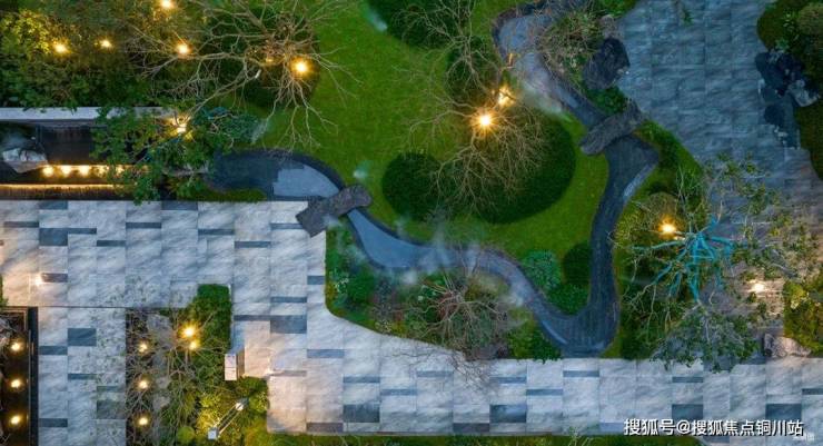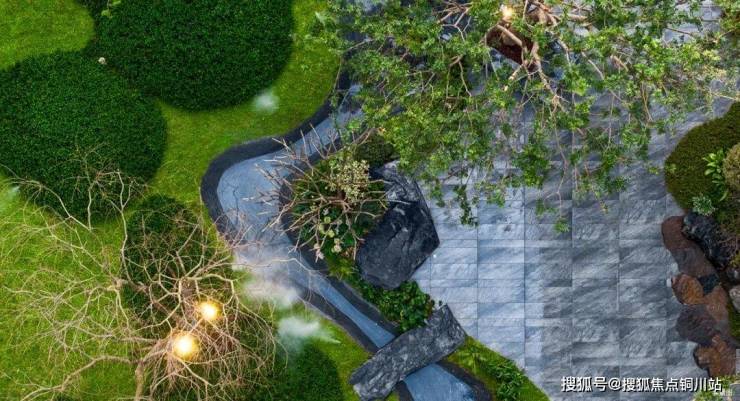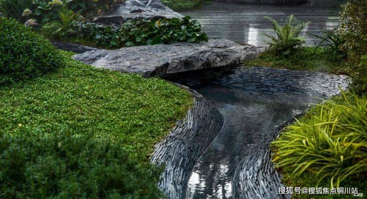 “披一肩镜水柔情,游走于林樾庭间”。撷取中式园林的造园精髓,叠石成山、理水成园,以溪流顺着绿岛贯穿园区, 溪底的瓦石由老匠人手工打磨、铺贴而成,如作画般仿照溪水形状铺就,以水的“曲”加深景的“幽” ,水面以山石作桥,更添野趣。