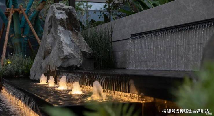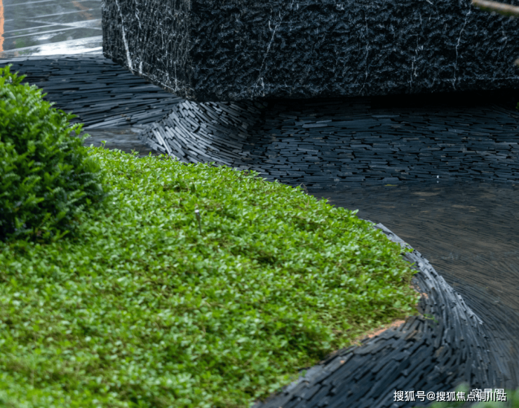 “未见其景,先闻其声”层叠水景的屹立透露着不可言说的气场。流水拍打着石材上发出淙淙的水声, 置石的刚毅与三叠泉的柔美 ,如同一幅流动的画卷,以独特的艺术语言,讲述着古老的故事。