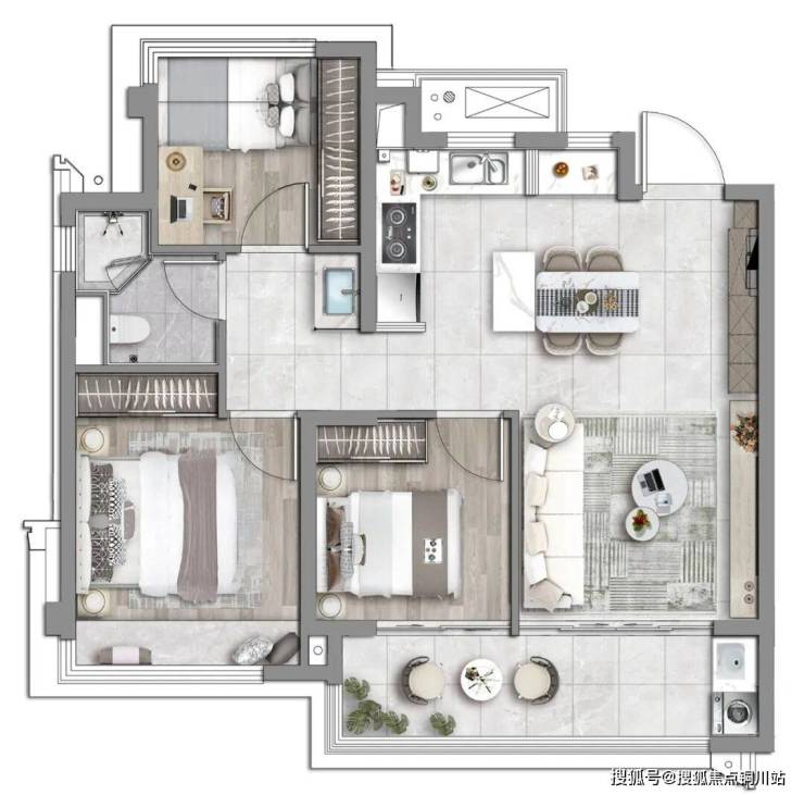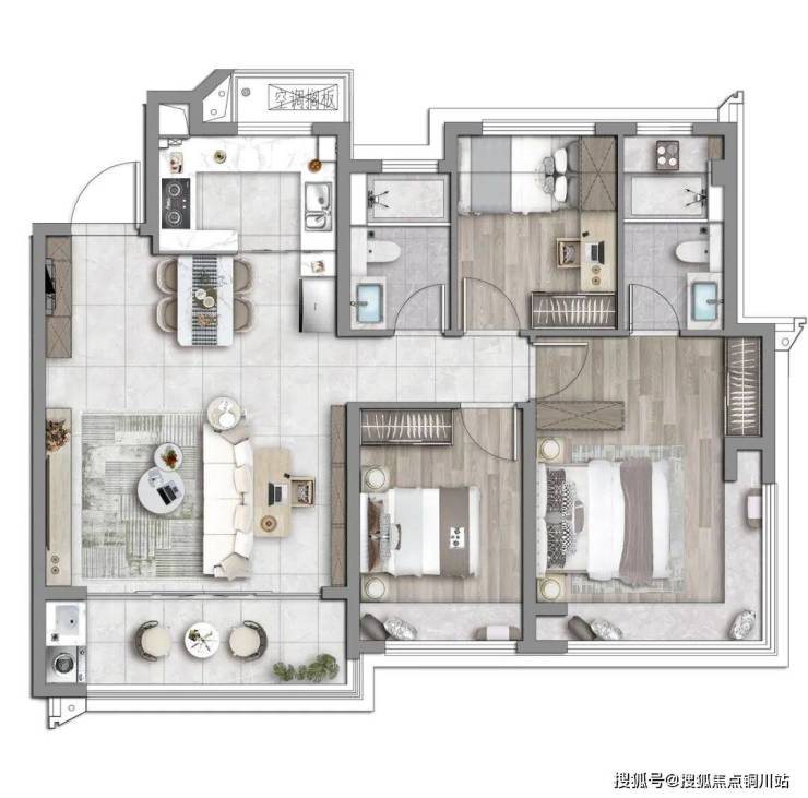 建面约110㎡3室2厅2卫边户:整个户型的南向几乎无墙体阻碍,使得从阳台到飘窗形成巨幅的采光面;另外,主卧套房做了罕见的270°环幕大飘窗设计,是全南京唯一110㎡内阳光主卧,270°观景采光,尺度拉满;项目阳台全封闭交付,是板块内唯一的三玻两腔。