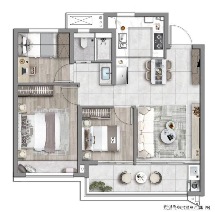 建面约89㎡3室2厅1卫边户:全明通透舒适,主次卧均带有90度转角窗;双阳台,大开间,厨房预留岛台;卧室飘窗到阳台全部设计有玻璃窗转角、洗漱台盆和卫生间做了分离。