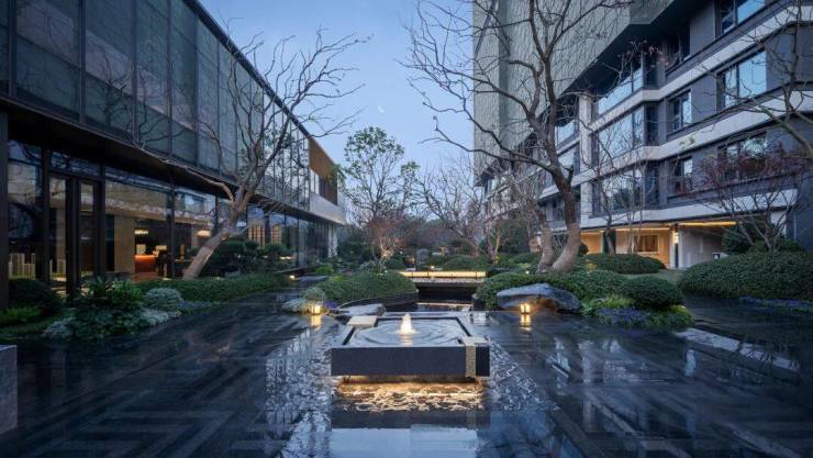 嵌落在各个景观组团中的户外会客厅,搭配大块深色石材地面铺装,呈现出景观与房屋融为一体的世纪府宅。