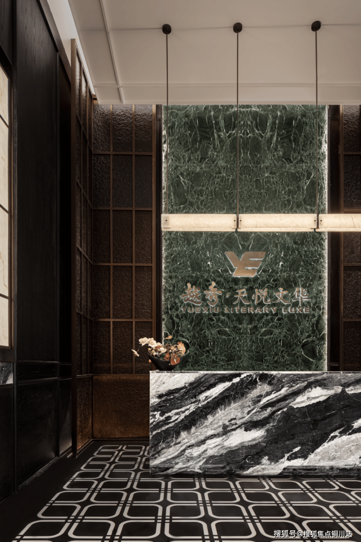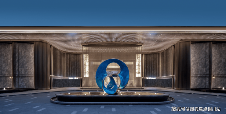 入口的艺术雕塑炼以江湖气质,将水的灵动与通透凝练其中,彰显其艺术品味与高定匠心。垂落的金属帘,营造出酒店式门厅的奢华感、尊贵感,作为障景,提供了相对私属的高端归家体验。