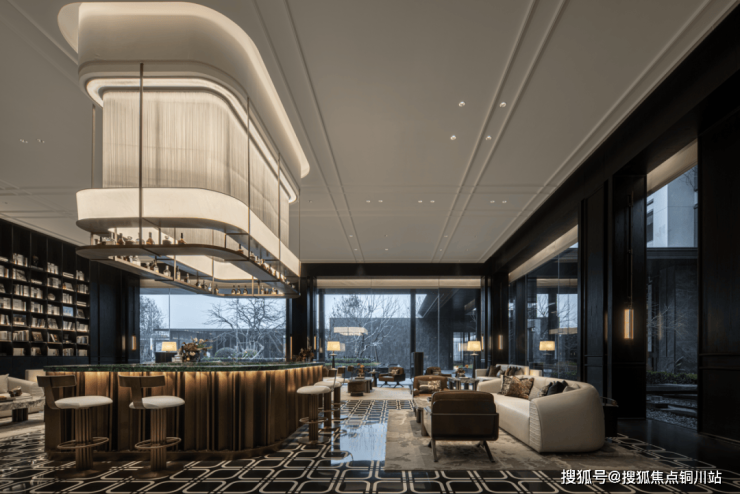 ⽔吧区,作为空间中的社交场域,摒弃传统的单⼀布局,以围合之势,造流动之境,呈现⼀处雅致的天地。