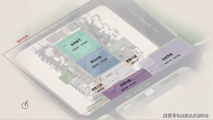 通过连廊、架空层、建筑挑檐等灰空间联动,串联主入口、各单元的入口、全龄活动空间、宅间花园,营造全龄社交剧场,形成多重院落空间,打造园区的活力动线;