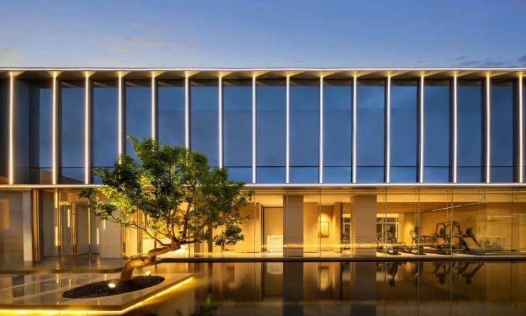 西侧宽约百米的的酒店式门庭,百万级的迎客松,以苍翠温润的力量感,续写着时间的故事。迪奥米黄景墙的细腻肌理,以东方隔景智慧,轻柔地划分内外。
