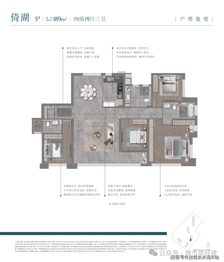 传承东方文化礼序,汲取《春江花月夜》与《四景山水图·春》等传世诗画名篇灵感,设计“三进门仪,园林九景”。一进高门大院,无雨迎宾;二进望湖水庭,游弋诗情;三进古树茶庭,漫步画境。同时融汇五庭四院,形成全围合式布局,呈现集诗意东方美学与当代人居审美需求于一体的中式高端园境,真正做到“内得东方山水,外望大江大湖”。