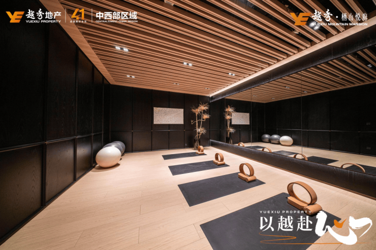 健身房采用天花格栅吊顶、地面运动地板、墙面隔音墙板材料进行装饰,还贴心设有更衣室,健身器械均为国际一线品牌舒华,跑步机、椭圆仪等设备一应俱全。还有专门为女性业主打造的一个瑜伽房,下楼即可健身运动。