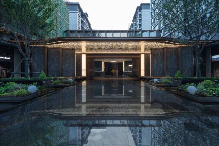 为彰显国风景观画蕴含的国匠精神,归家府门,以对称奢享水景为前景,水、木、石辉映成趣,严格规整的对称精工树池布局,叠水水景,榉树方阵,在业主眼前徐徐展开,归家仪式感直接拉满。