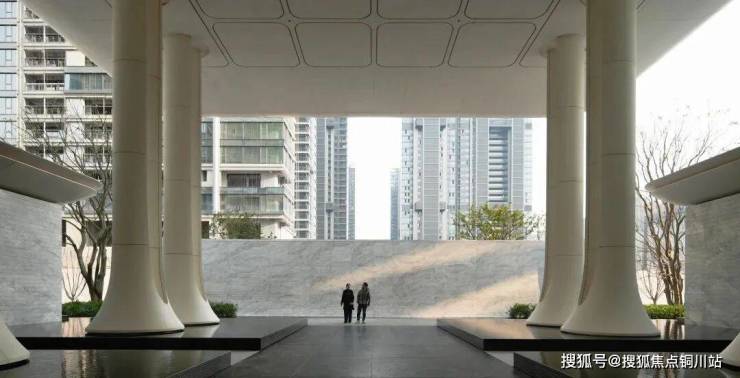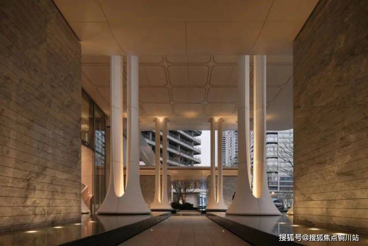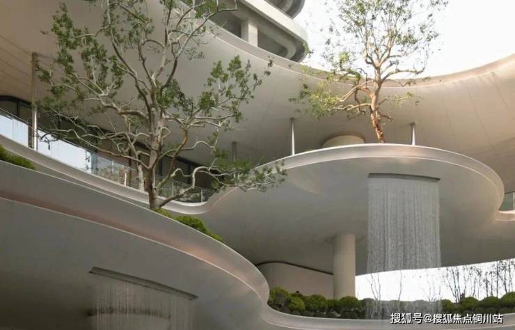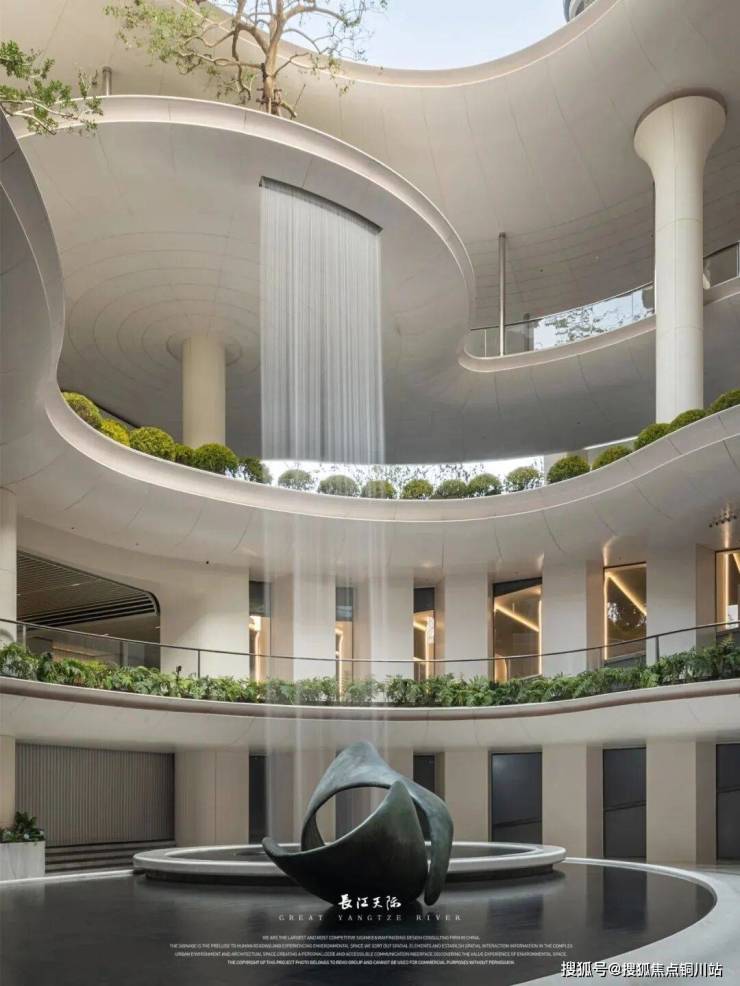 穿过门庭,迎面而来的是一片开阔的中庭空间,设计灵感源自于长江的波澜壮阔,以流动的线条和简洁的几何形状,勾勒出一幅现代与自然和谐共存的画卷。从上往下看,4层叠水空间景观,3级站台落客系统,双会所体系,宛如新加坡樟宜国际机场,潺潺的流水从天而降,溪涧之畔绿树如茵,微风与碧树轻轻拂去归来的嘈杂与疲倦,一幅满怀自然生机的立体森境呈现在我们眼前,成为驻留、漫步、欣赏的生活新地标。