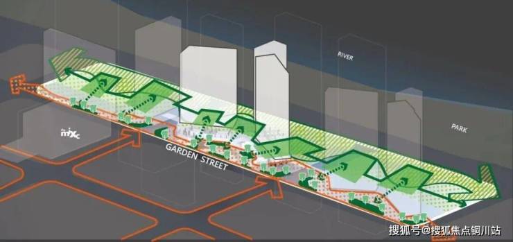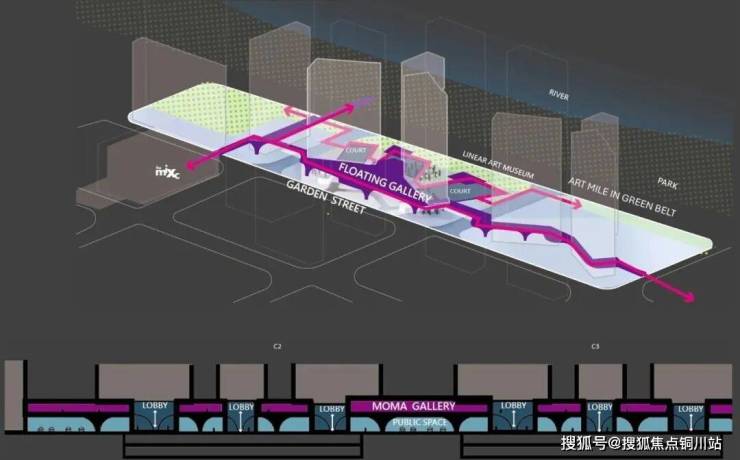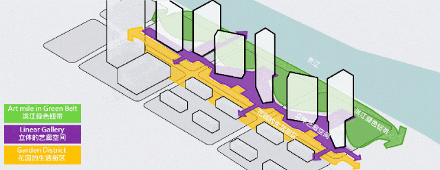 围绕“超级底盘”规划设计,打造立体丰富的多标高空间。这样的“超级底盘”拥有都会艺廊、超级门厅、云梦翠谷、私密景观花园及高线花园架空层,有节奏、对人友好的丰富多元的业态空间,让大平层社区与长江、江岸、万象城、周边住区形成良性友好的连接。