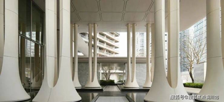 8根米白色树形空间立柱矗立于入门大堂,采用UHPC超高性能混凝土板材精心打造而成,流动的线条搭配简洁的几何形状,让10.5米挑高大堂和风雨连廊如同向上生长的巨树,营造出一种生机勃勃的雨林氛围,尽显高级与优雅。