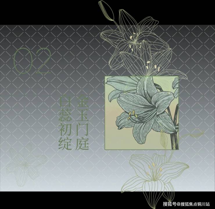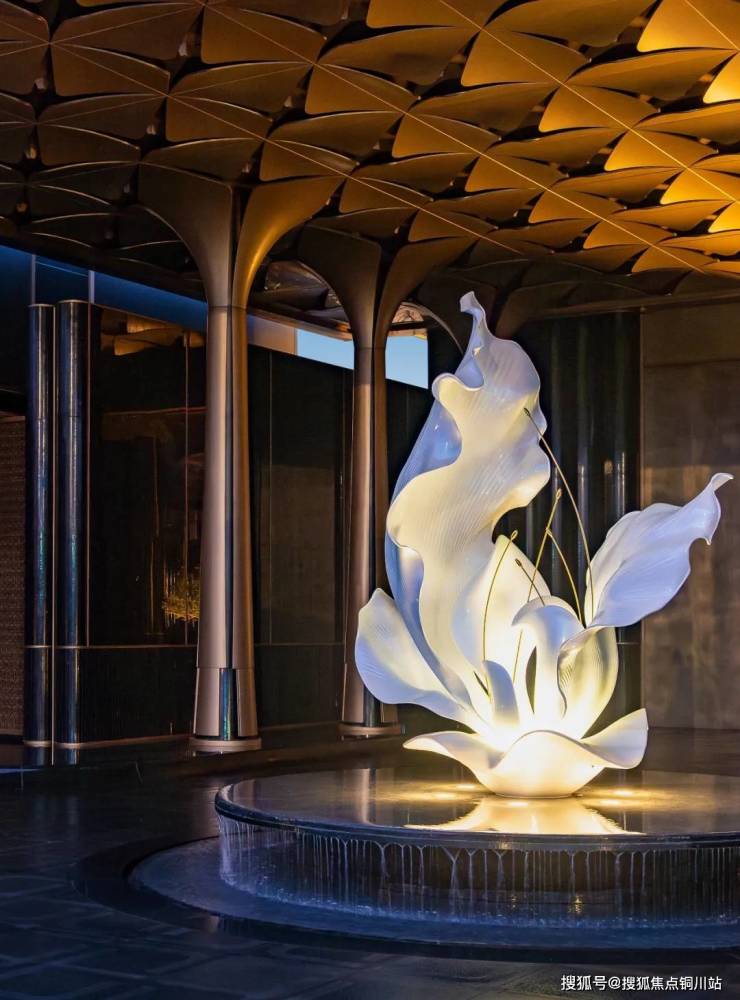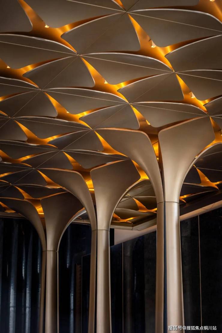 主入口极尽门庭奢礼。全长约42m的超宽门庭,迅速攫住人们的视线。设计提炼百合元素,大尺度雨棚由8根巨型花瓣柱阵列托起,200多片百合花瓣组成的金色吊顶之下百合雕塑熠熠生辉。一扇玉石大门静待开启。