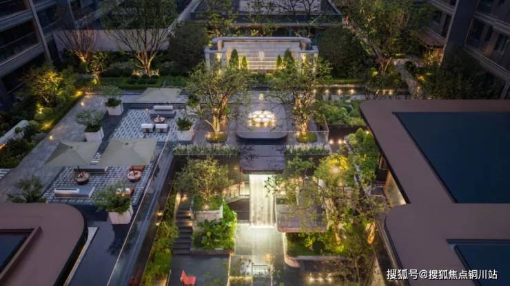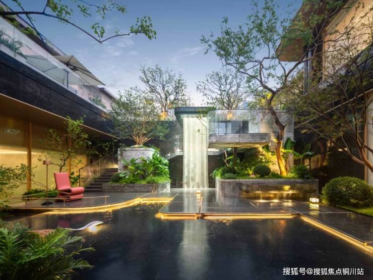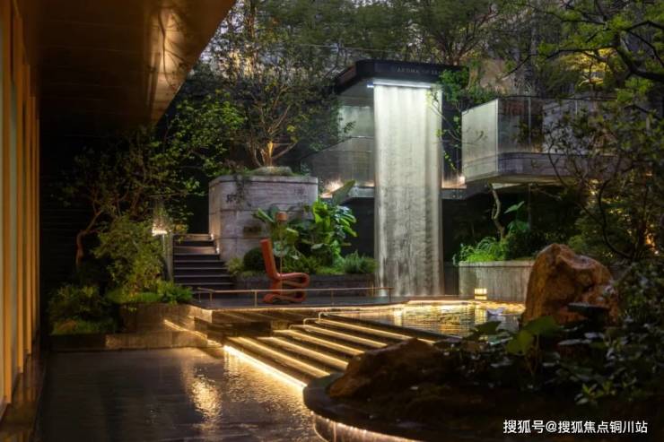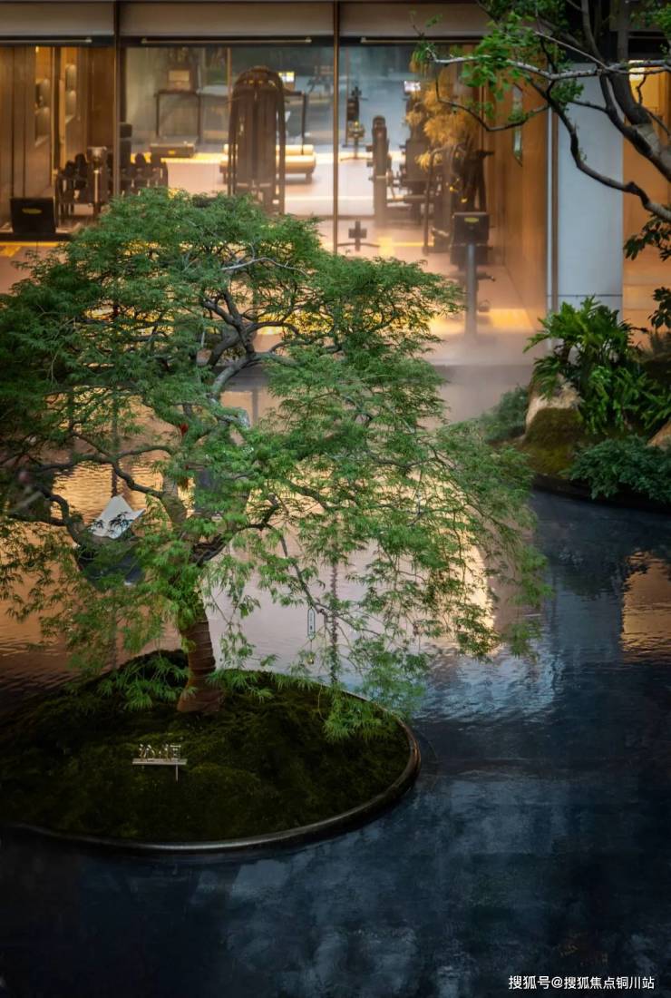 飞瀑如一练素錦,成为视觉焦点,串联地上与地下空间。而4颗丛生大乌桕矗立四方,自然界定庭院边界,又营造出私密氛围。拾级而下,阶梯式绿化、斑驳崖壁、镜面叠水树池次第展开。羽毛枫、茶梅、杜鹃葳蕤舒展,汀步、卡座相映成趣,构成一幅诗意的立体山水画。