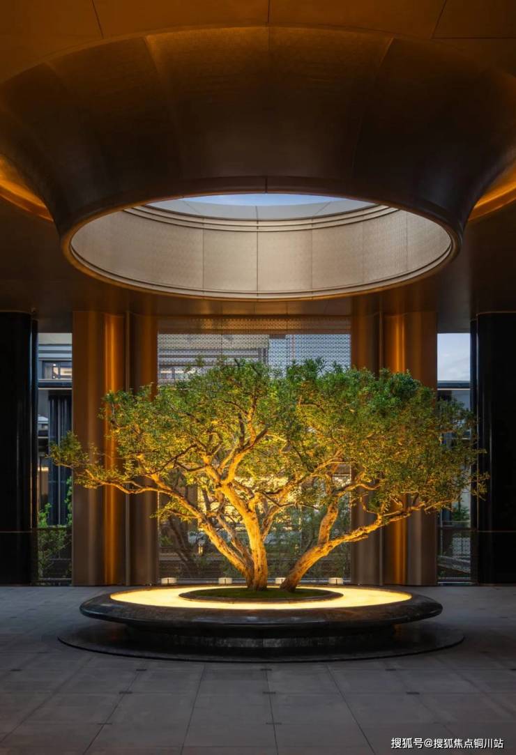穿过玉石大门,但见透光穹顶之下,石榴树虬枝盘曲,亭亭立于黑色树池之上;圆形天井撷取一捧自然天光,盈盈落于池树之间,与环形玉盘相映成趣。金属镂空格栅背景与两侧安哥拉黑整石雕琢的弧形水景围合出类似内天井的空间,将传统空间叙事与现代审美巧妙融合,形成静谧优雅的光影空间。