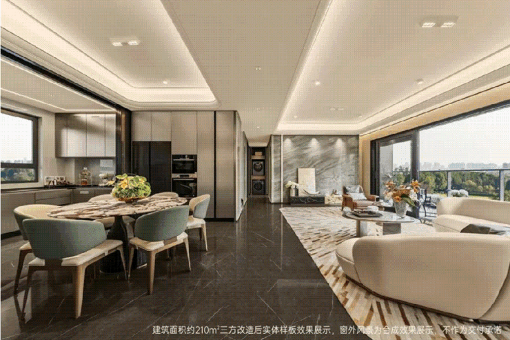 尤其是刚刚亮相的约210㎡实体样板间,全屋南向八面宽,带来采光视野上的平权,户户可享建面约40㎡花园院落,约6.6米挑高尺度,其“空中庭院”面积与营造的仪式感,仍是目前市场上难以复制的产品标签。