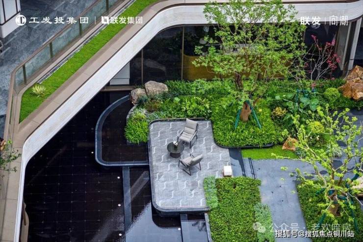 与之相连的立体下沉庭院,更像一座“流动的自然美术馆”。三层立体景观是设计的灵魂,上层是开阔的景观会客厅,中层是错落生长的绿植,下层黑金沙石材铺就的叠水巷道,垂直布局如同一幅立体画卷。