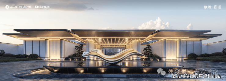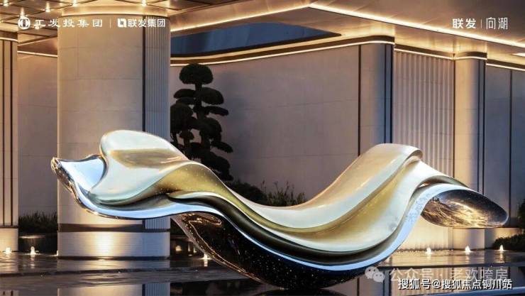 门庭中央的“流金淌银”雕塑,蕴含“纳福”的理念,覆以手工 18K 金箔,阳光照射时,金箔光泽与下方静水面的倒影交织,金银双色恰好与“金银湖”形成在地文化的共鸣。