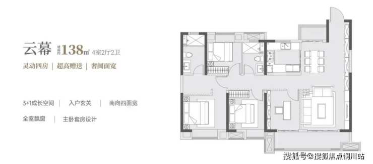超大尺度面宽、阔绰大横厅、南北双阳台、主卧小家化、多飘窗拓展等设计