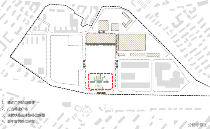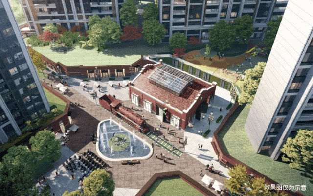 设计初期,充分考虑了赓续项目历史文脉和留住城市记忆的双重性,用地南侧结合老厂特色工业元素及前场两棵百年古树,集中打造与城市共享的文化广场,延续历史工业记忆,形成项目亮点。保留的德式小楼,打造成德建广场网红打卡地,同时向东西方向延伸打通天车广场、科创产业集群、四方机车公园的商业文化轴。