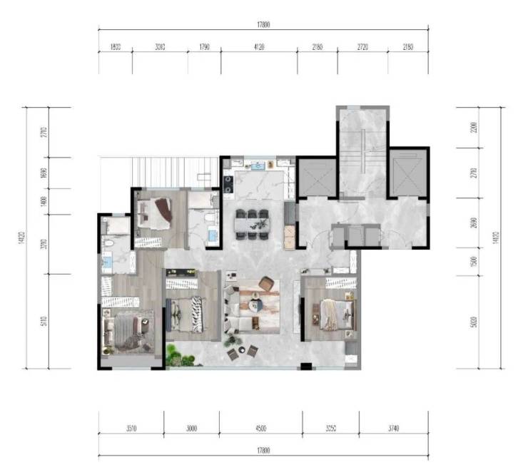 一种选择是四面宽户型,三卧室朝南,还有超10.5米贯通客厅和双卧室的三联大阳台,整体的采光效果更好一些。其中一个南向卧室还可以拆掉改造成大三室,实现7.5米开间的大宽厅效果。