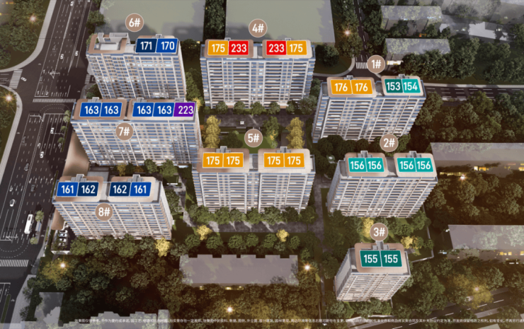 5#楼位于小区中心景观南侧的楼王位置,全是175平的大四室;8#楼南侧全是低矮楼栋,大明湖的观湖视野更好,规划的则是162平的四面宽和161平的四叶草户型;7#楼紧邻着小区主入口和下沉庭院景观,尤其是东边户223平的大平层,可以享受小区最好的景观视野。
