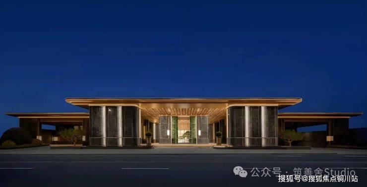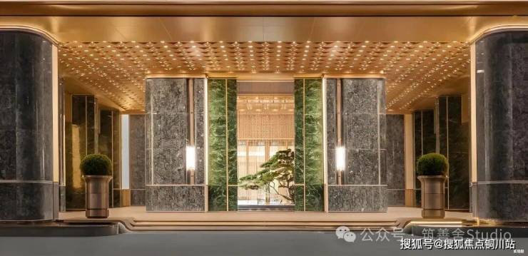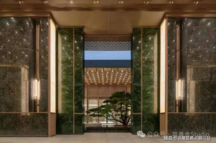 绿城春月锦庐社区大门,恢弘气派,宽达73米,高近8米,左右对称布局尽显庄重。入口两侧以普拉达绿奢石精心排布,门厅的龙鳞吊顶,约730枚鳞片,奢华质感无与伦比。