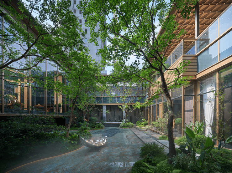 穿过大厅,下沉式庭院也做好了,和普通的乔木灌木不同,华侨城天荟的庭院直接选择移植整棵成年树木,即使在初冬也郁郁葱葱,显得极具生命力。