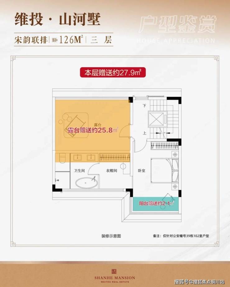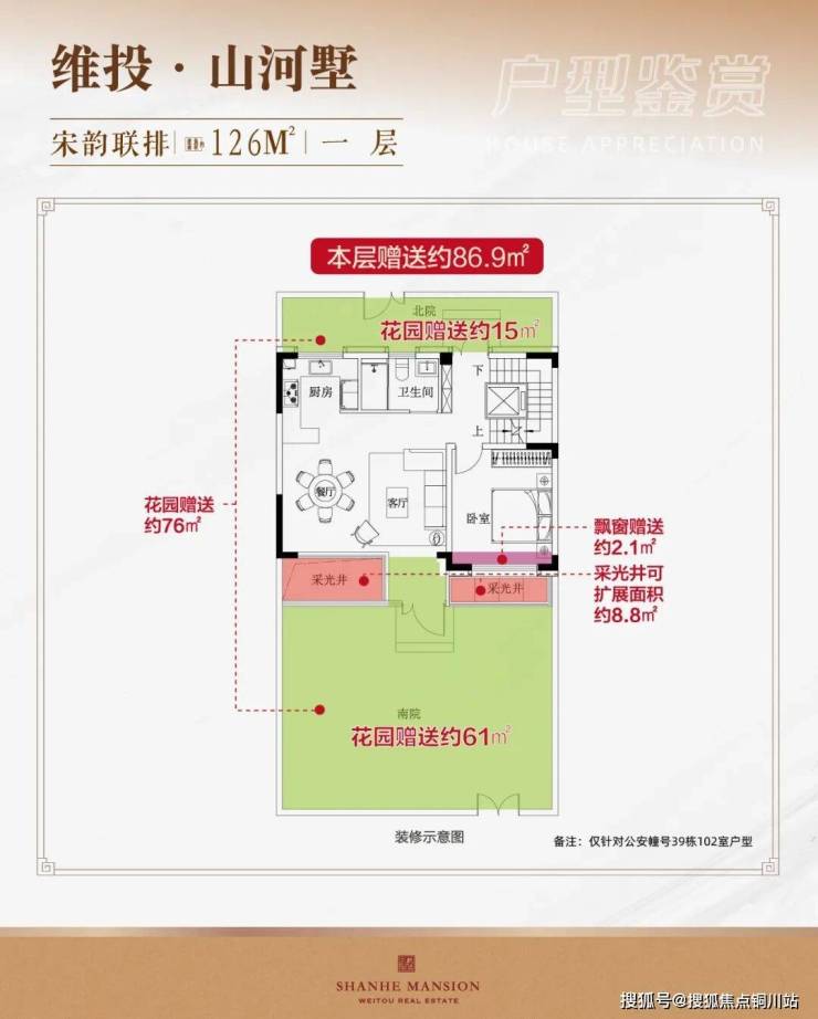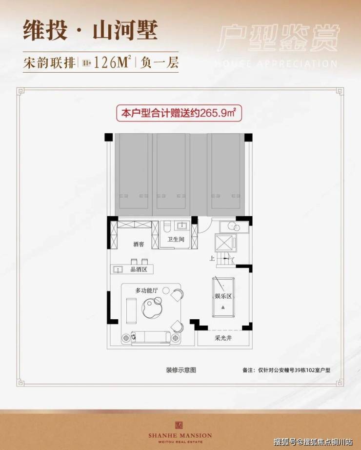 以39号楼102室,建面约126㎡联排别墅为例,总赠送面积约265.9㎡,实得面积超390㎡。真正做到了“买一套得三套”的极致空间利用。