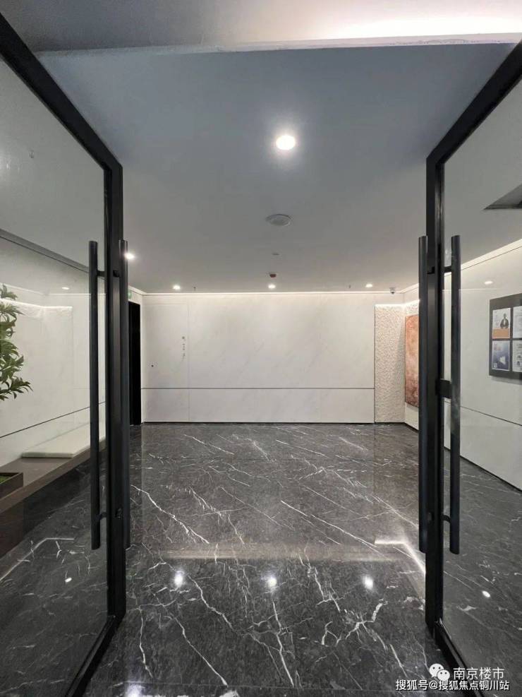 地下入户大堂,悬浮吊顶+黑色地砖,墙上挂了装饰画,还设置了座椅。
