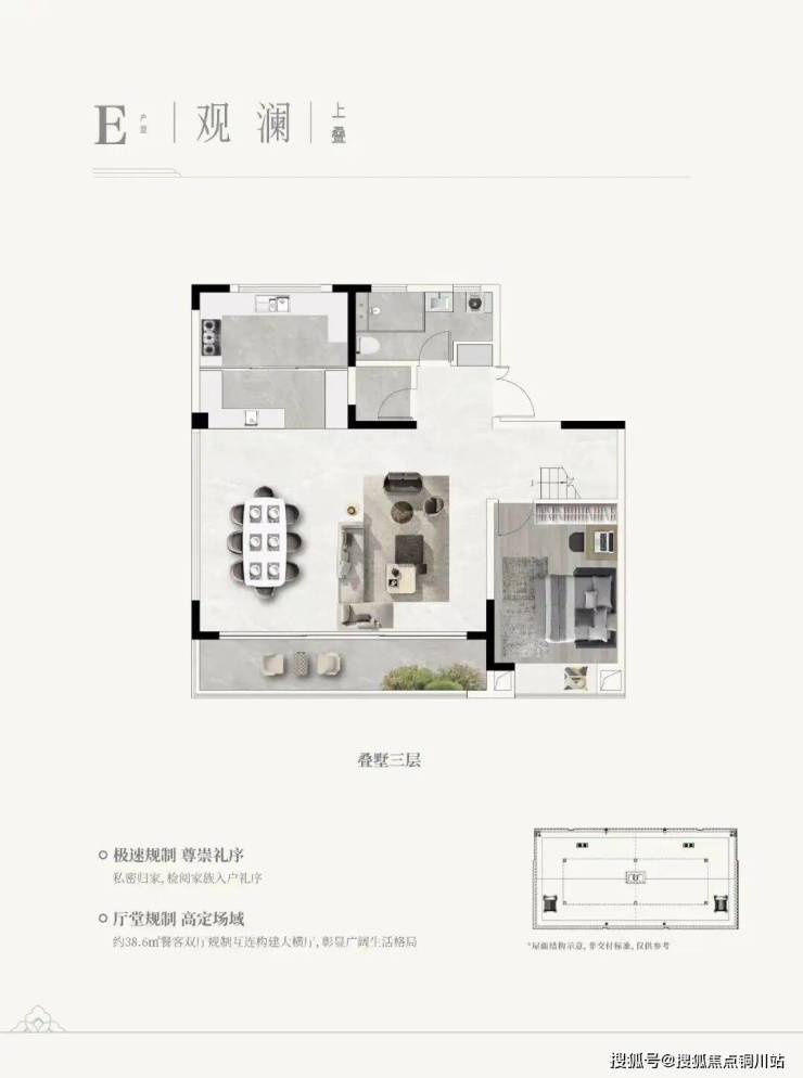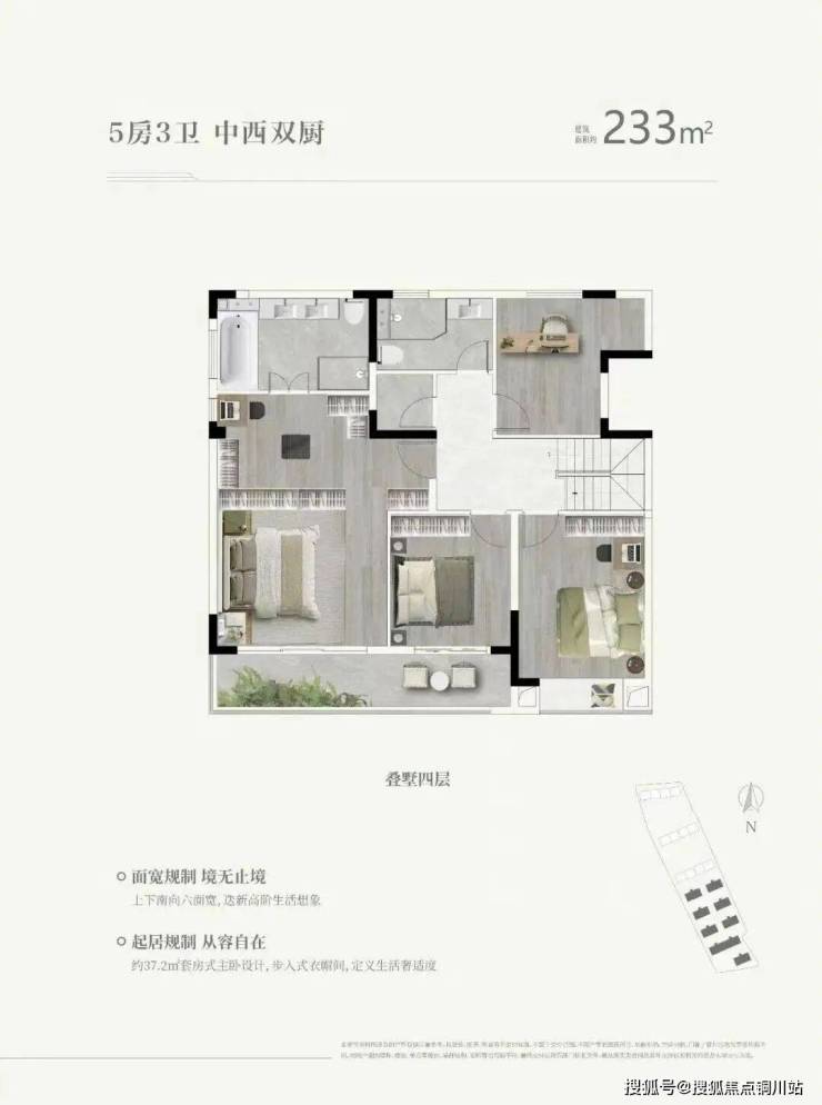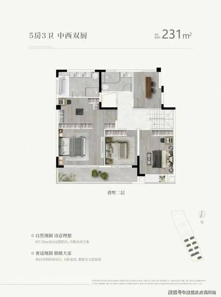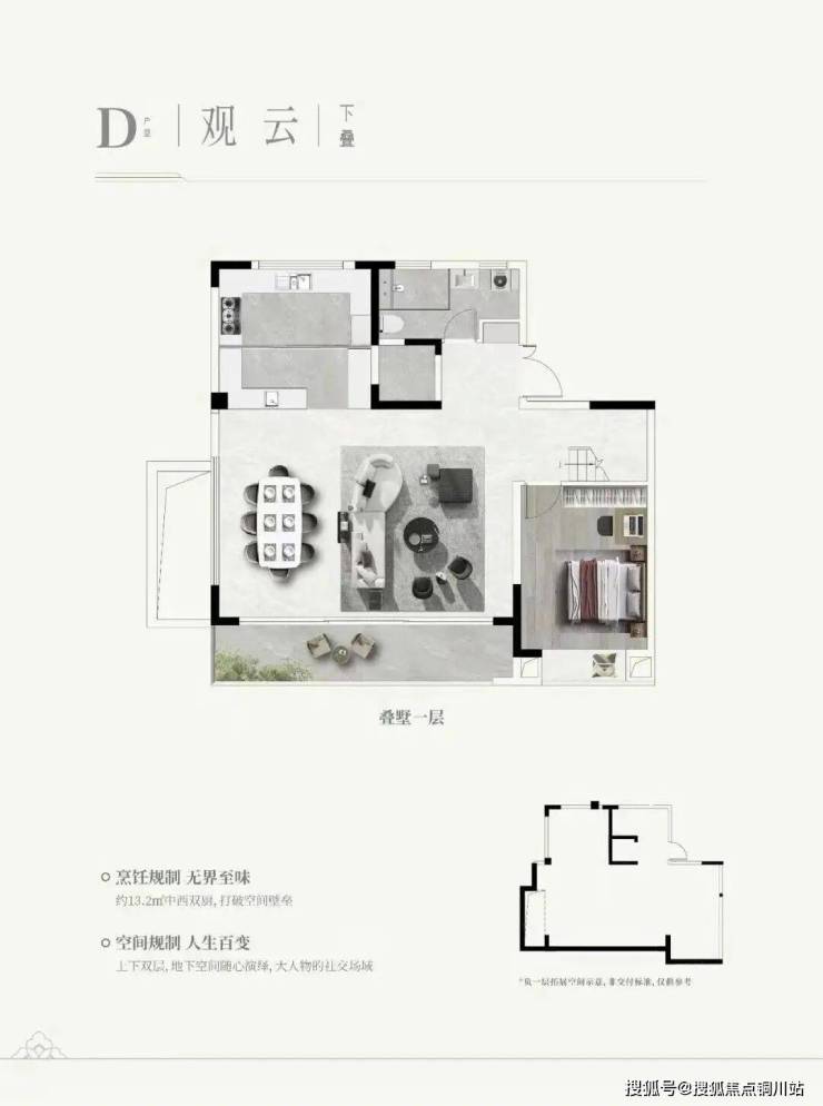 精研居者需求,致力构筑高净值人群理想人居,身份气度从容进阶,以有所成的人生格局空间,收揽从容人生的胸怀气魄,叠墅采用上下双叠设计,主卧酒店式套房、中西双厨设计、LDKB一体布局、MAX级观景视野等,以超大空间彰显非凡人生。