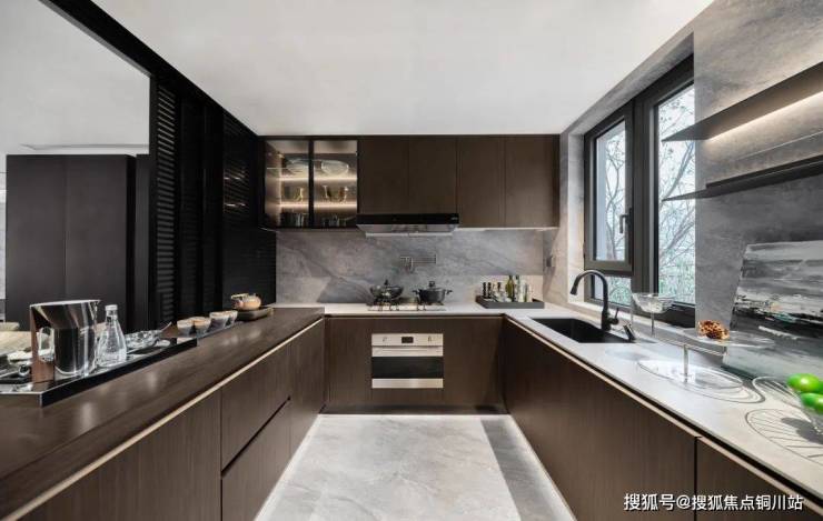 U型的家庭厨房,内部还带有家政间,整个空间西面、北面都做了开窗设计,进到样板间里,感觉亮堂堂的。