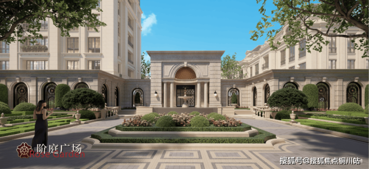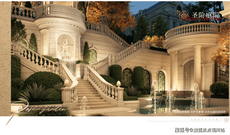 拾序如冕的【圣阶庭院】,源于吉隆内特《阳光下的少女与花》与意大利16世纪台地园林的代表——埃斯特庄园的艺术光影,大面石材景观凝练对称与层级精髓,融合古典照壁雕塑,彰显尊贵的仪式感。